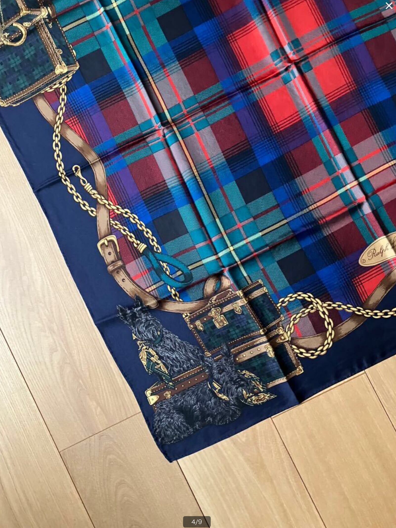 【TRL58】Ralph Lauren ラルフローレン スカーフ ネイビー マルチ総柄(犬、チェーン、トランク) シルクスカーフ