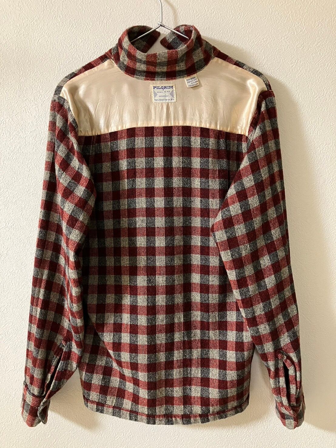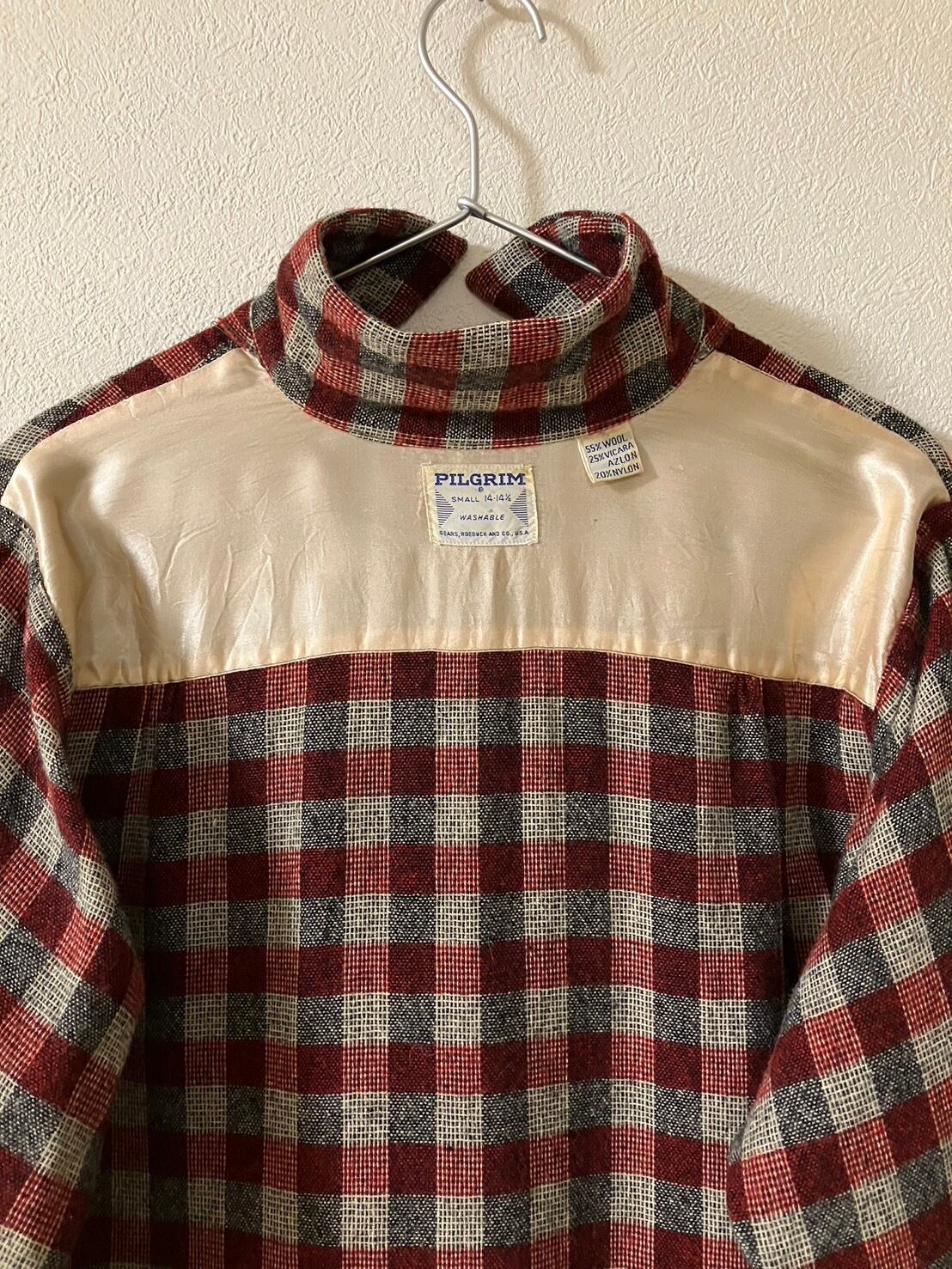 【TVT65】60s PILGRIM 長袖シャツ(オープンカラー) チェック ウール×ナイロン混紡 Sサイズ 50sロカビリースタイル ビンテージ