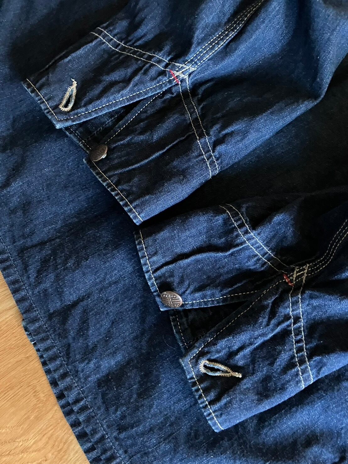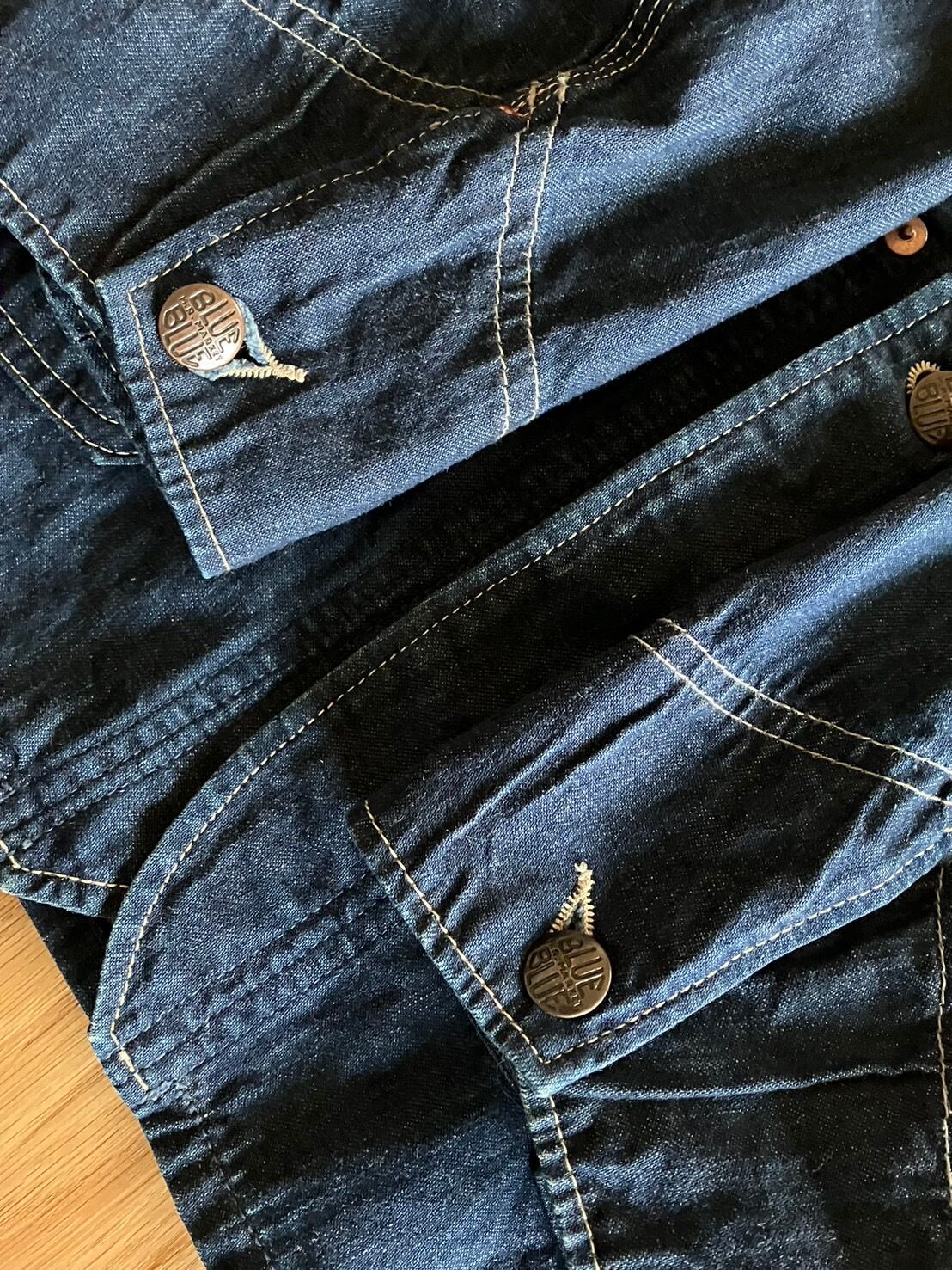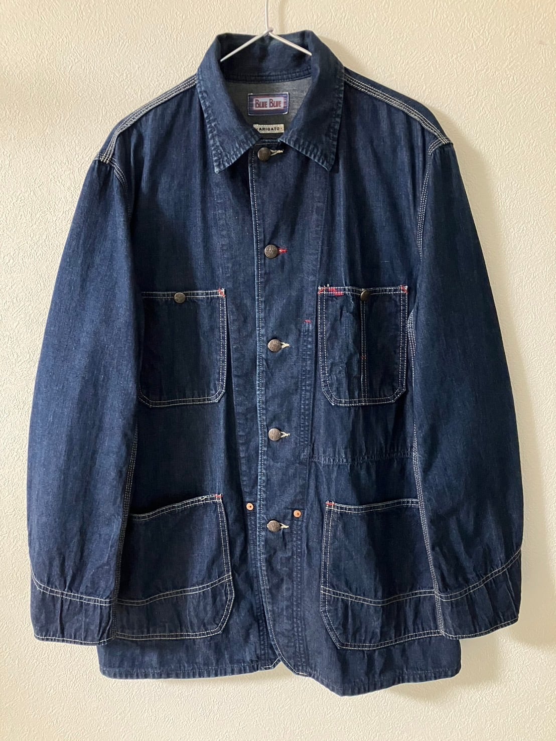 ★前身頃合わせ/ボタン×5(BLUE BLUE H.R MARKET刻印入り)前身頃ポケット×4(両胸ポケットのみ裏地付き/トリプルステッチ/7oz程の生地感です。