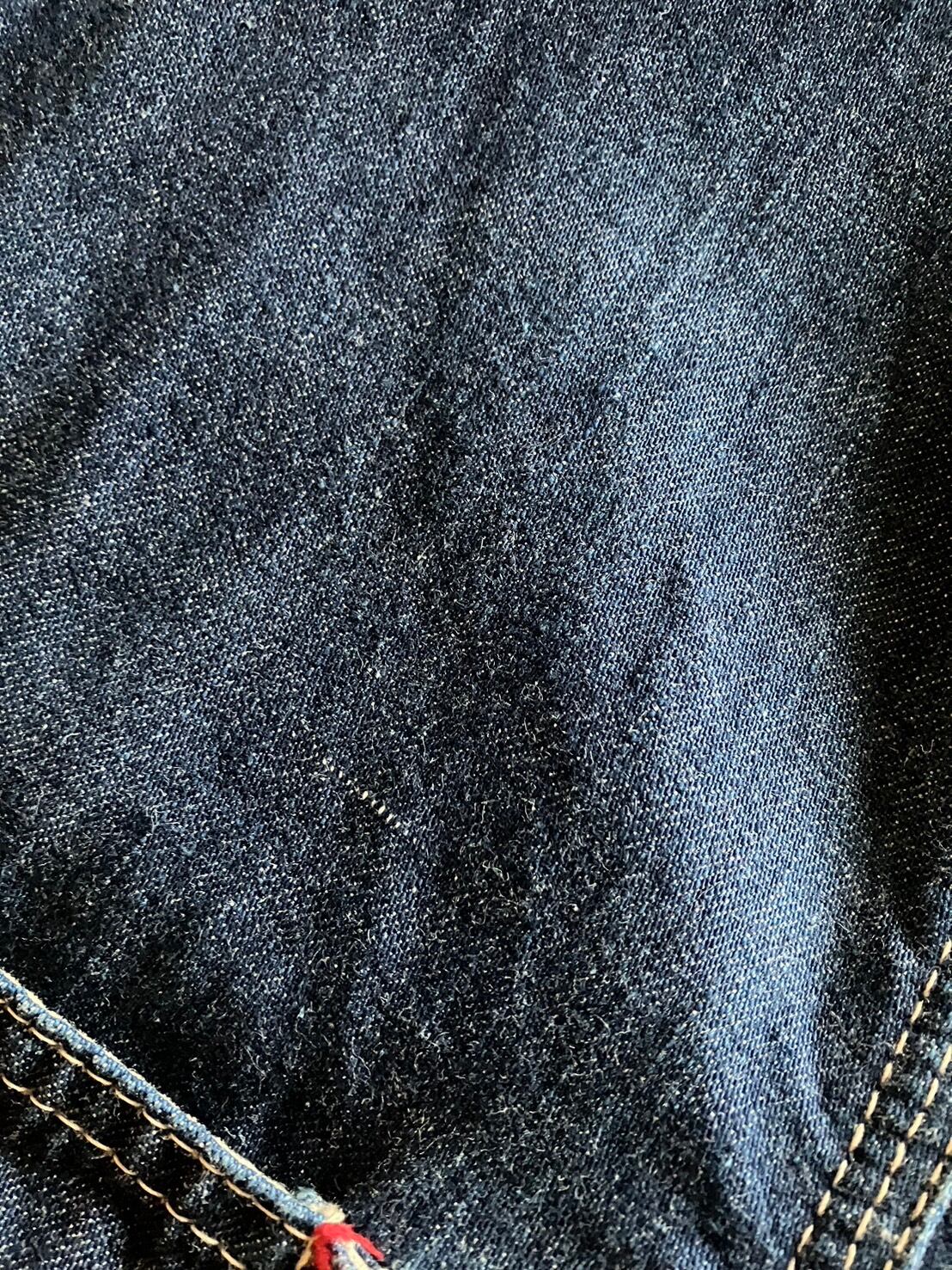 ★インディゴデニム製品の特性上、所々に若干の色落ち(あたり)、縫製の乱れ(解れ)等があります。/ポケット、肩口付近、アームホール、襟裏他