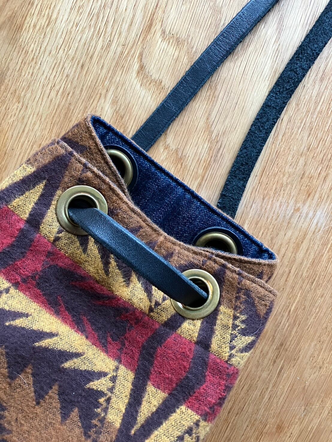 ★色柄/ブラウン系/ネイティブパターン/裏地インディゴデニム(マチ部分は両面インディゴデニム)素材です