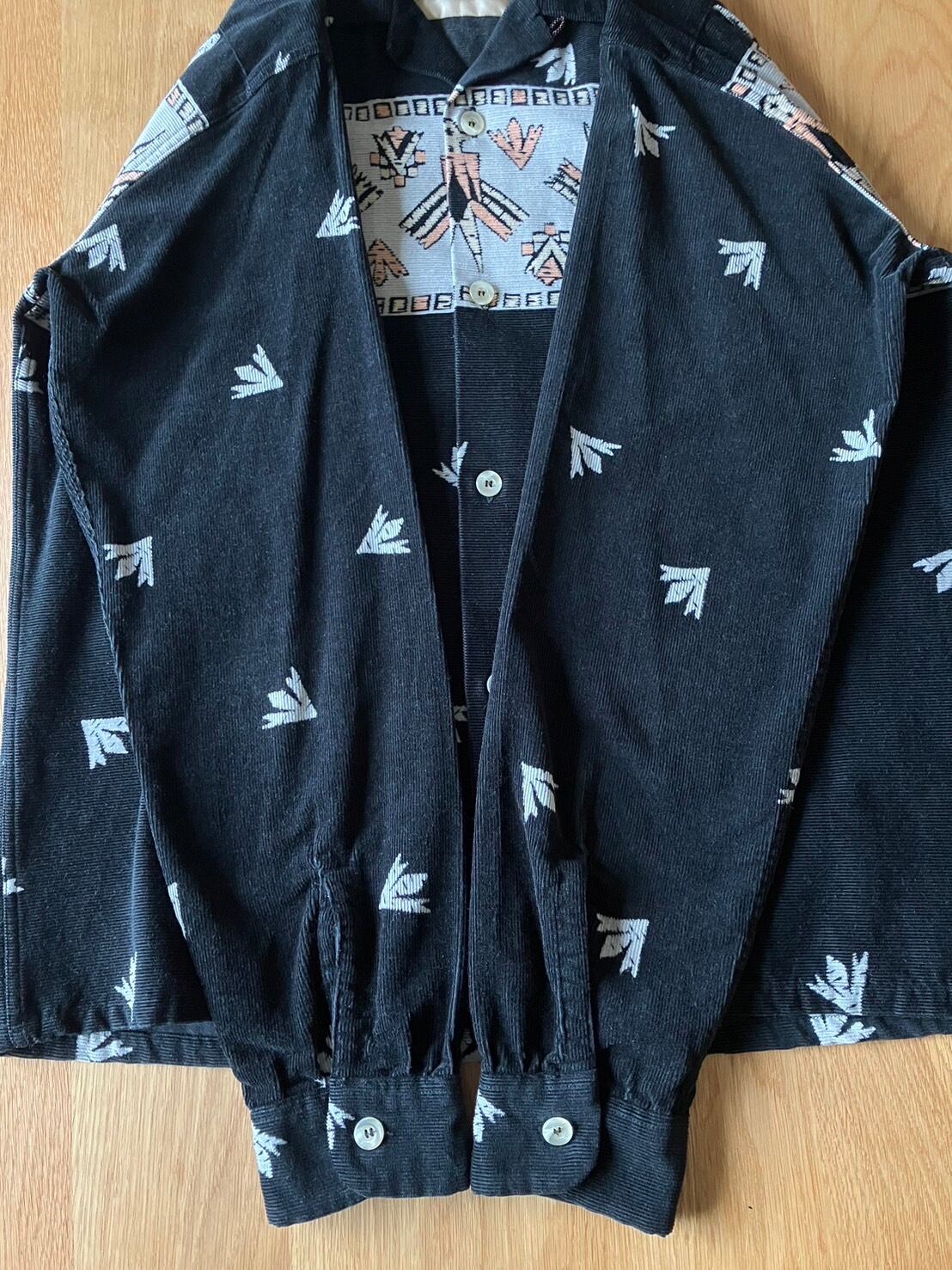★ボックスシルエット/ループ留めカラー/左胸に柄の合わせられたポケット付き/背中プリーツ付き/コーデュロイ生地が横向きに使われています。